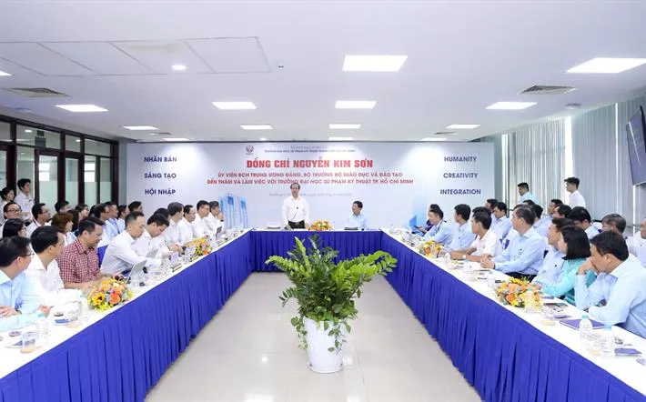 Phát biểu kết luận buổi làm việc, Bộ trưởng Nguyễn Kim Sơn đánh giá cao những thành tích Trường ĐHSPKT TP.HCM đã đạt được qua nhiều thế hệ. Nhận định đây là một trường sư phạm kỹ thuật then chốt của ngành, Bộ trưởng khẳng định luôn ủng hộ mạnh mẽ những chủ trương, cách làm đúng đắn, sáng tạo của nhà trường.