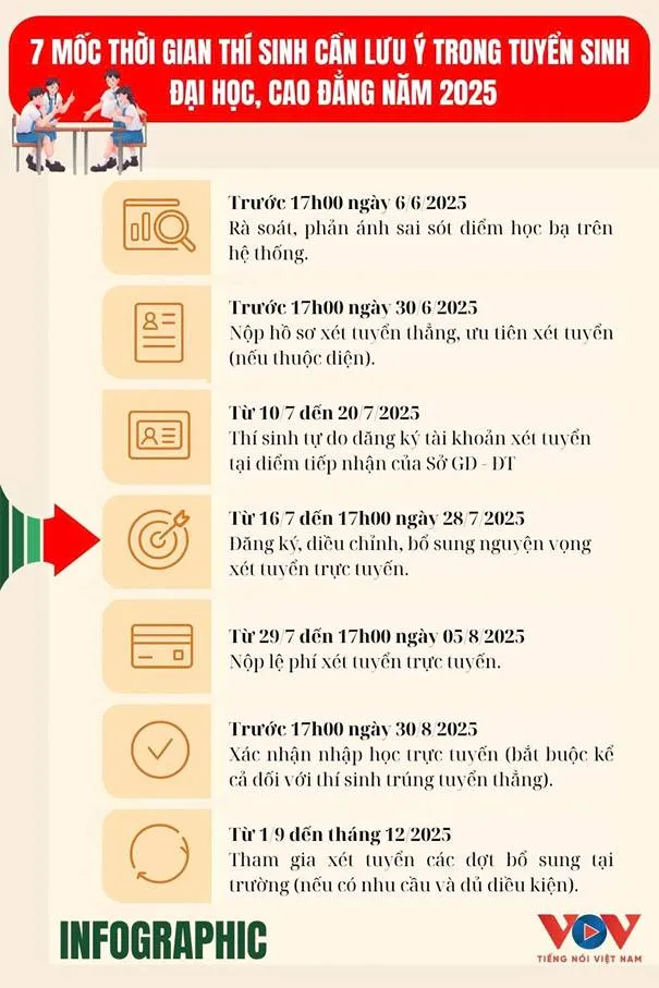 Từ ngày 29/7 đến 17 giờ 00 ngày 5/8/2025, thí sinh phải nộp lệ phí xét tuyển theo số lượng nguyện vọng xét tuyển bằng hình thức trực tuyến theo hướng dẫn của Bộ Giáo dục và Đào tạo.