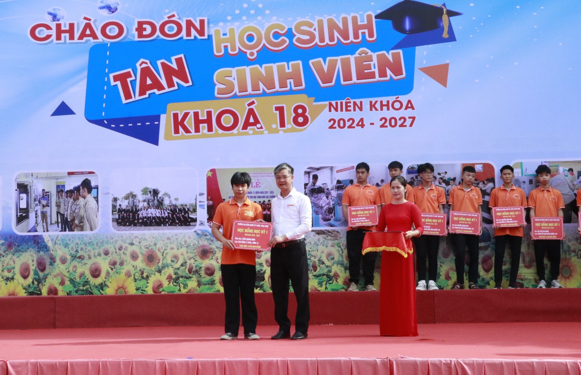 Đồng thời, thay mặt nhà trường, Hiệu trưởng Đặng An Bình đã chúc mừng 54 em học sinh, sinh viên khóa 16 và 46 em học sinh, sinh viên khóa 17 đạt được những thành tích xuất sắc để nhận được học bổng trong học kỳ I của năm học 2023-2024 với tổng số tiền trên 478 triệu đồng. Phần thưởng này sẽ góp phần hỗ trợ và khích lệ các em tiếp tục nỗ lực trong quá trình học tập tại nhà trường. Tin tưởng rằng các bạn tân học sinh, sinh viên nhập học khóa 18 ngày hôm nay sẽ tiếp nối các anh chị khóa trước nỗ lực giành những thành tích trong học tập.