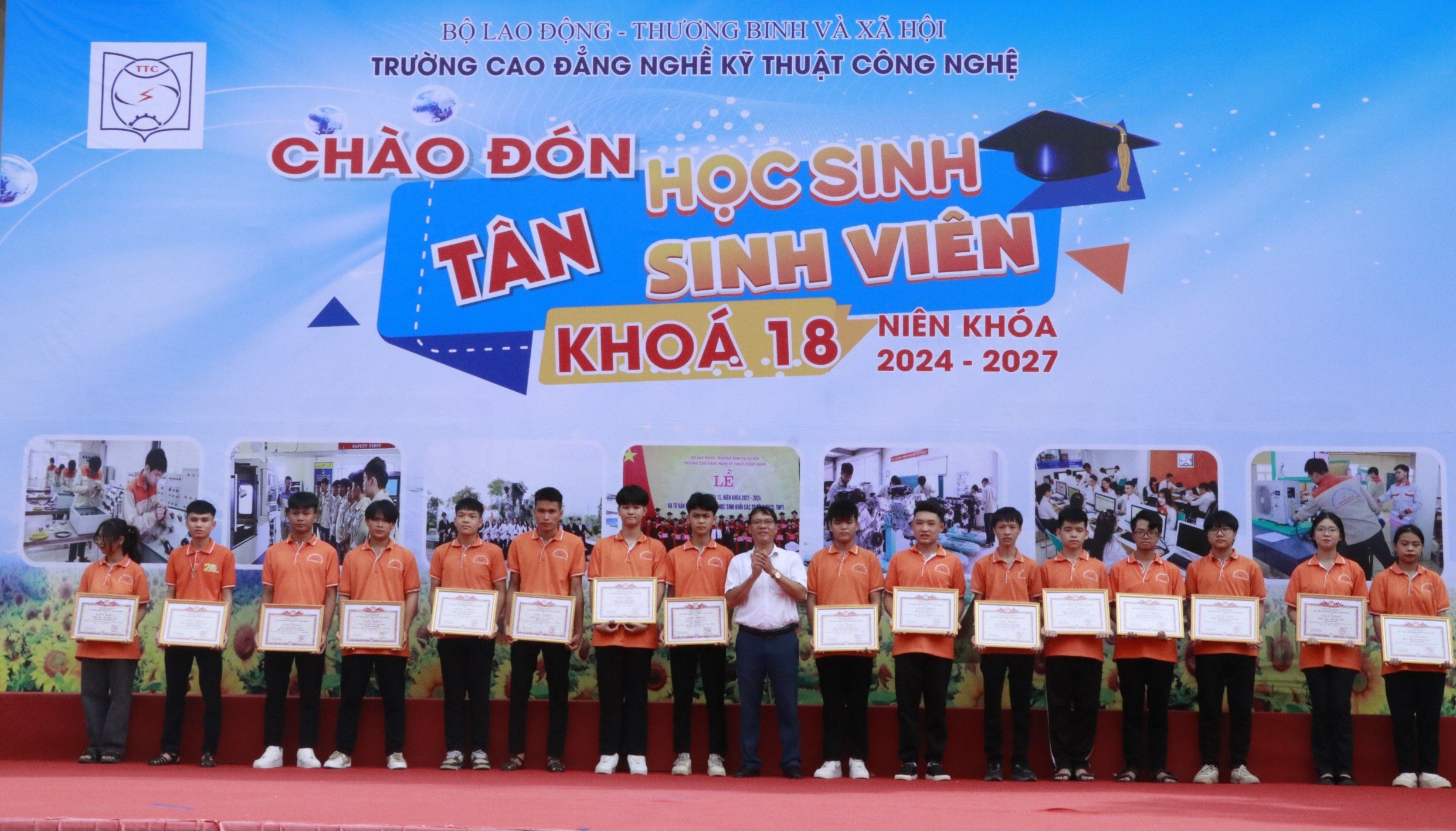(Molisa.gov.vn) - Ngày 29/6, Trường Cao đẳng nghề Kỹ thuật công nghệ (Bộ Lao động - Thương binh và Xã hội) tổ chức đăng ký nhập học, chào đón hơn 500 tân học sinh, sinh viên khóa 18 (niên khóa 2024 – 2027), hệ vừa học Trung cấp nghề vừa học Trung học phổ thông (hệ 9+). Chương trình có sự tham gia của hàng trăm học sinh, phụ huynh và toàn thể cán bộ, giảng viên của Nhà trường.