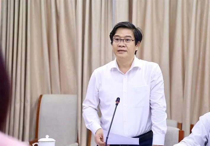 Phó Cục trưởng Cục Nhà giáo và Cán bộ quản lý giáo dục Phạm Tuấn Anh báo cáo tại cuộc họp