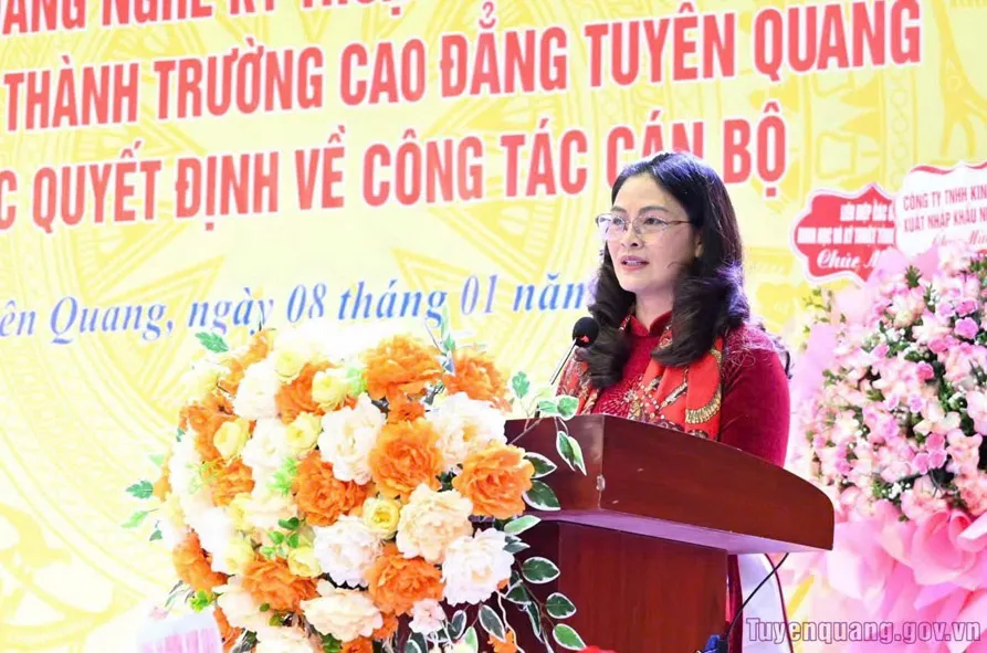Bên cạnh đó trường Cao đẳng Tuyên Quang cần tập trung đổi mới nội dung, chương trình đào tạo theo hướng chuẩn hóa, hiện đại hóa; tăng cường hợp tác, gắn kết với doanh nghiệp, cơ sở sản xuất, cơ sở giáo dục trong nước và quốc tế; đẩy mạnh đào tạo theo nhu cầu xã hội và thị trường lao động, đáp ứng yêu cầu phát triển nguồn nhân lực kỹ thuật cho tỉnh và khu vực. Đồng chí bày tỏ tin tưởng với truyền thống, tiềm năng và đội ngũ cán bộ, giảng viên hiện có, Trường Cao đẳng Tuyên Quang sẽ nhanh chóng ổn định sau sáp nhập, từng bước phát triển bền vững, trở thành cơ sở giáo dục nghề nghiệp uy tín, đóng góp tích cực vào sự nghiệp phát triển kinh tế - xã hội của tỉnh và khu vực. Phấn đấu đến năm 2035 trở thành trường Cao đẳng chất lượng cao, đến năm 2045 đạt tiêu chí Trường Cao đẳng thực hiện chức năng của trung tâm vùng trong đào tạo và thực hành nghề chất lượng cao …